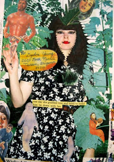 The process is part cut-and-paste subconscious frenzy with an eventual analytical edit to find the narrative thread in each piece. Neatly knit borders and lace-trimmed frames evoke feminine campfire crafts.